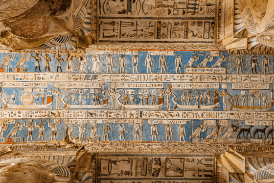 Visit to the Temple of Hathor, goddess of love, music, and art, at Dendera to view the early astrological signs carved on its ceiling.