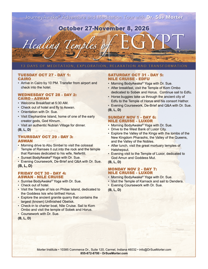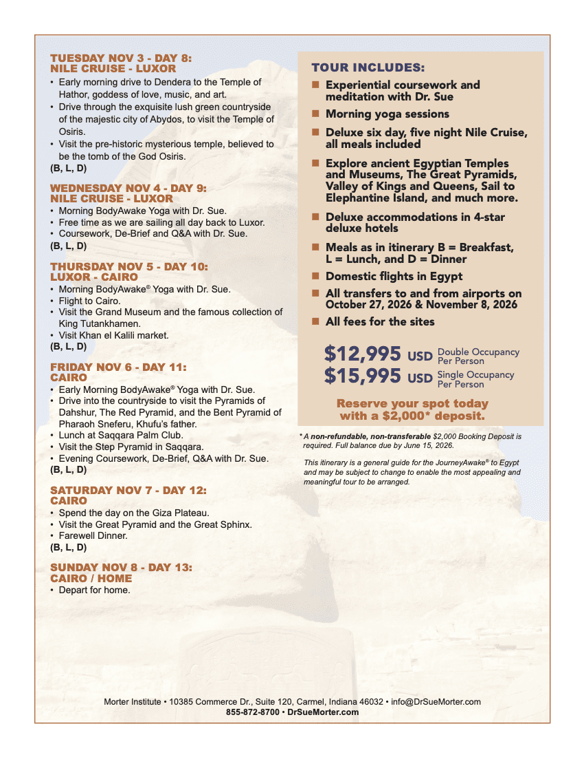 To register and save your spot for the 2026 JourneyAwake® to Egypt, please call Morter Institute at 855-872-8700.